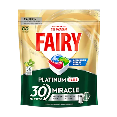 Fairy Fresh Scent Platinum Plus Automatic Dishwasher Tablets with Built In Prewash Power, prewashing some of the toughest grease and burnt on bits so you don't have to. Designed to be effective in short cycles*.
